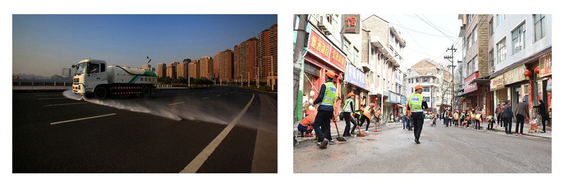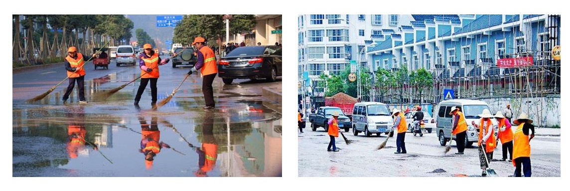 快速清理大面積路面垃圾、灰塵;人工清掃針對人行道、路邊死角,用掃帚、簸箕等工具細致清理。