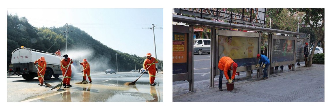 3. 公共設施清潔:定期清潔公交站臺、路燈桿、垃圾桶、路牌等公共設施,用抹布、清潔劑擦除污漬、灰塵,